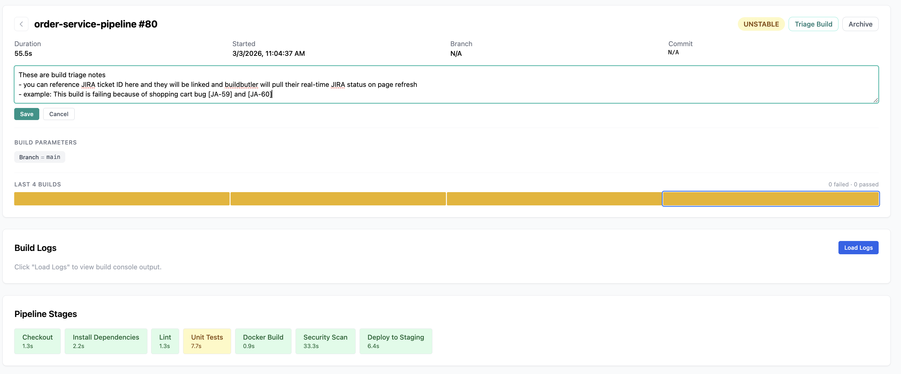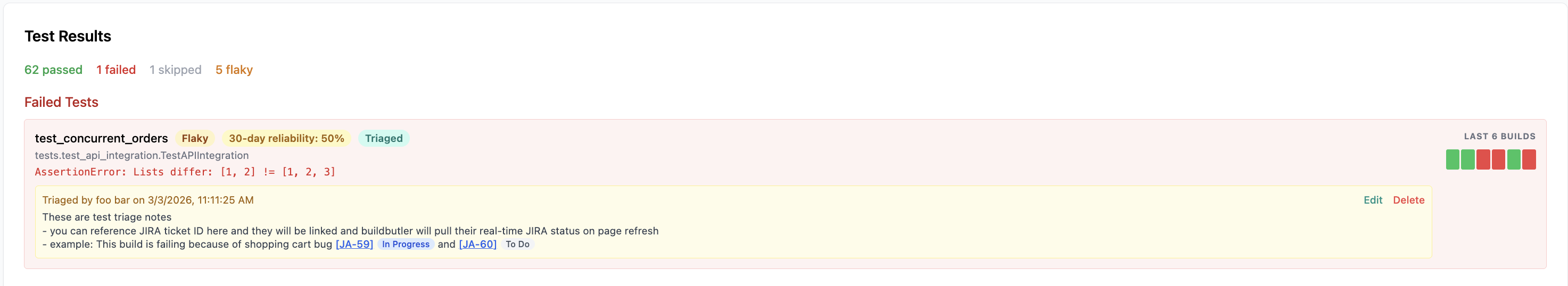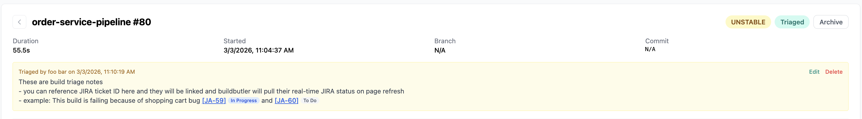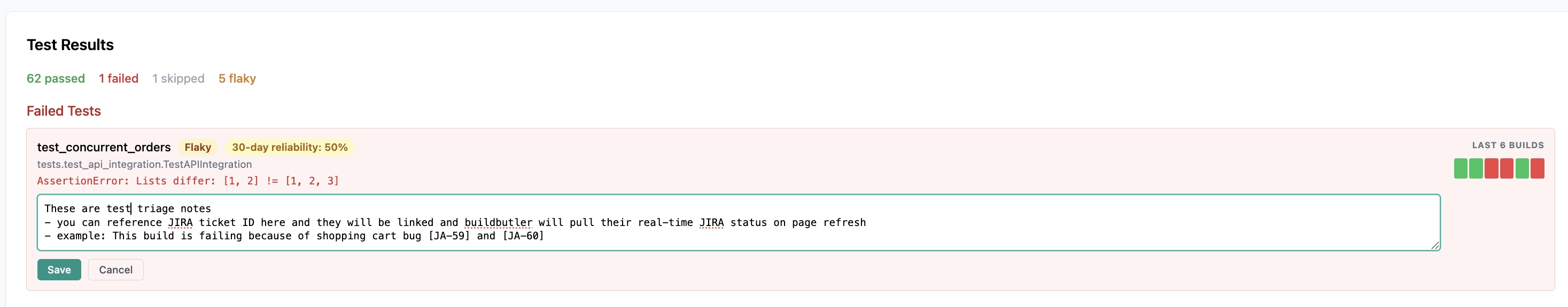 Both build triage and test triage notes support inline JIRA ticket references. Type a JIRA ticket ID in square brackets (e.g. [JA-59]) in your triage notes and BuildButler will automatically: