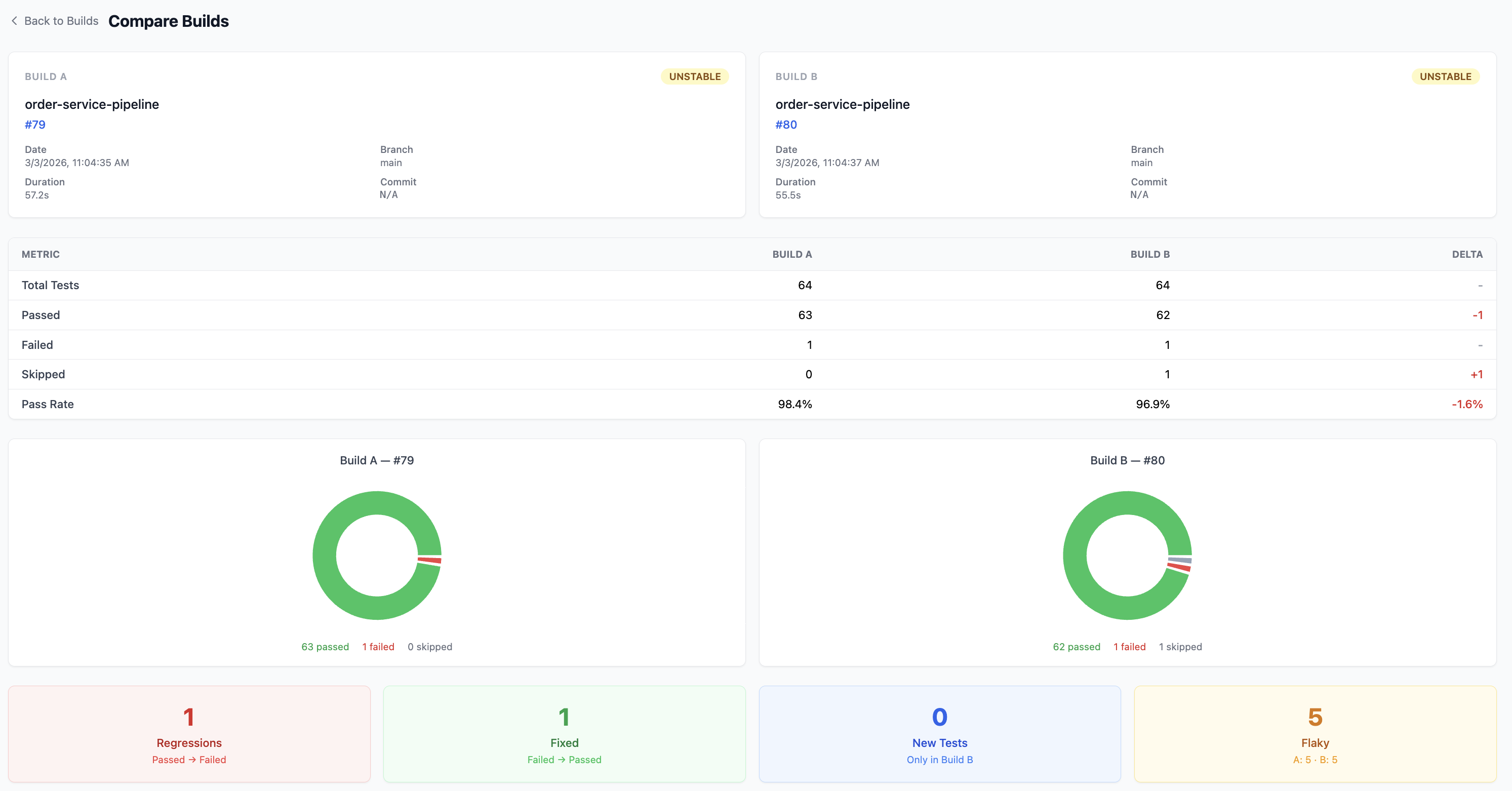 Below the metrics table, donut charts visualise the passed / failed / skipped breakdown for each build. This gives you an instant visual sense of test health.