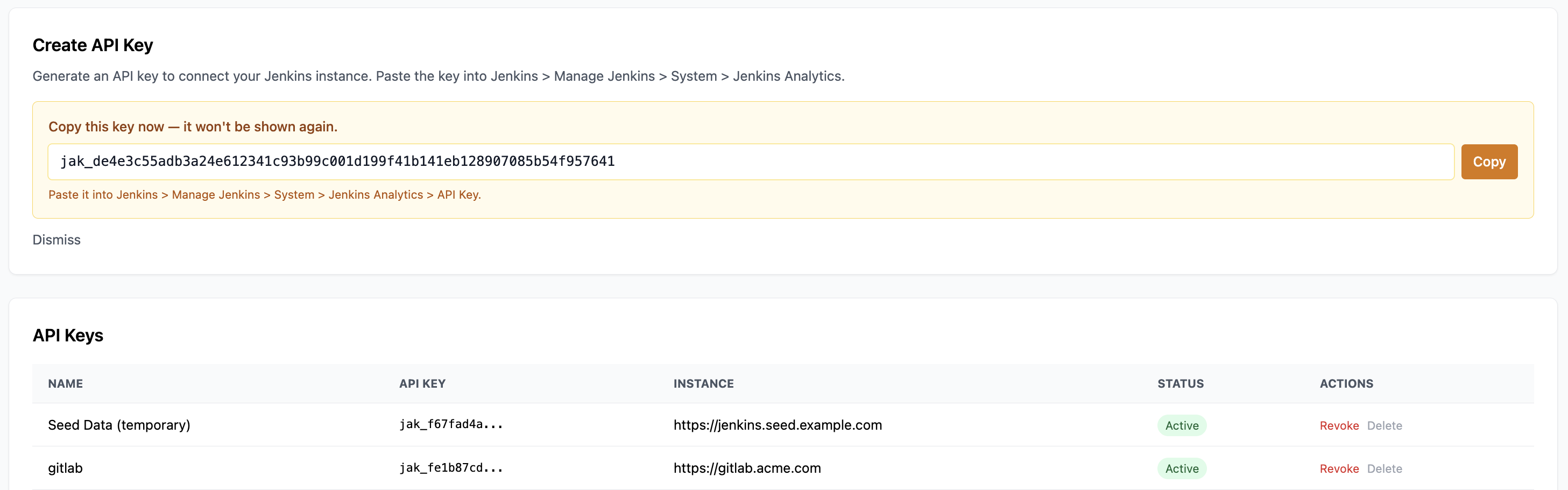 Multiple Jenkins servers: If you want to collect data from multiple Jenkins servers, use the same API key on each and specify a unique server label in the Jenkins plugin configuration to distinguish them.