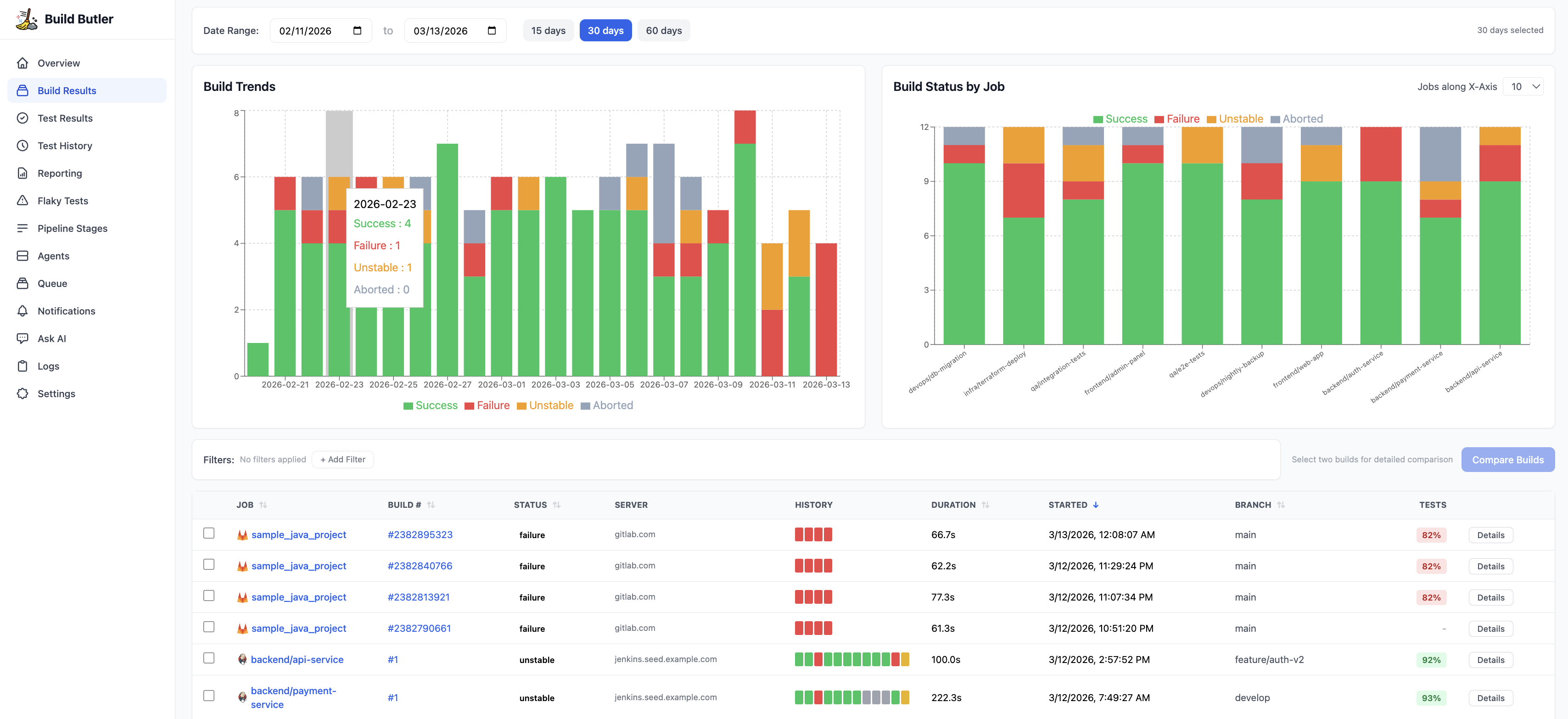 - PostgreSQL — build metadata, test results, pipeline stages, agent events