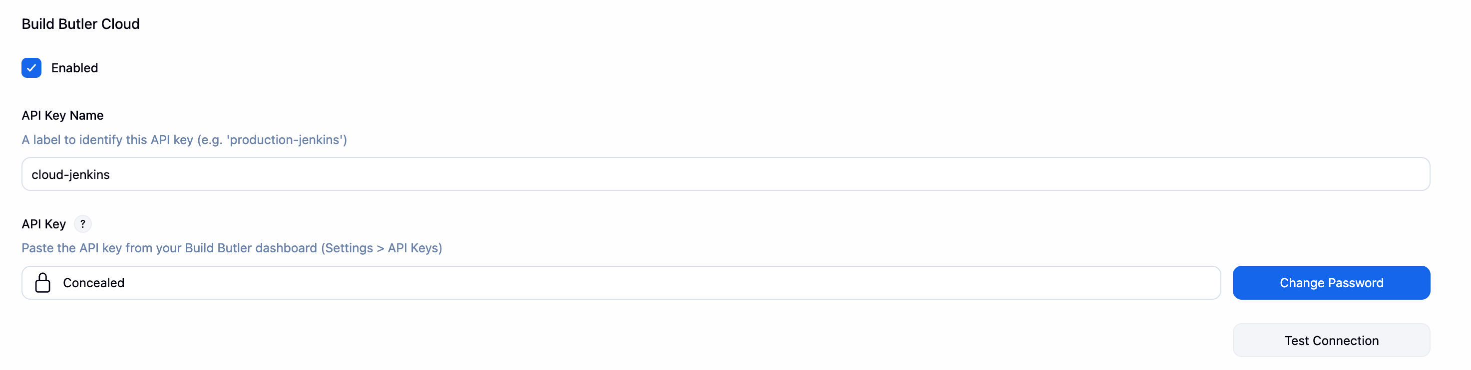 Connect as many Jenkins controllers as you like. Each Jenkins BuildButler Cloud configuration should use the same API key (generated in step 1) and a key name that identifies the Jenkins server (e.g. prd-jenkins).