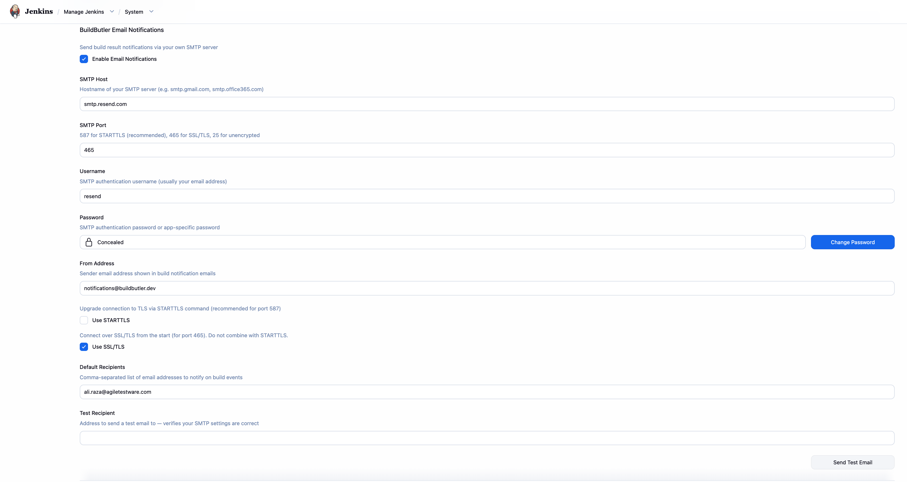 By default, Jenkins Cloud uses the BuildButler API for email notifications. You can override the BuildButler SMTP server with your own by going to Manage Jenkins → BuildButler Email Notifications.