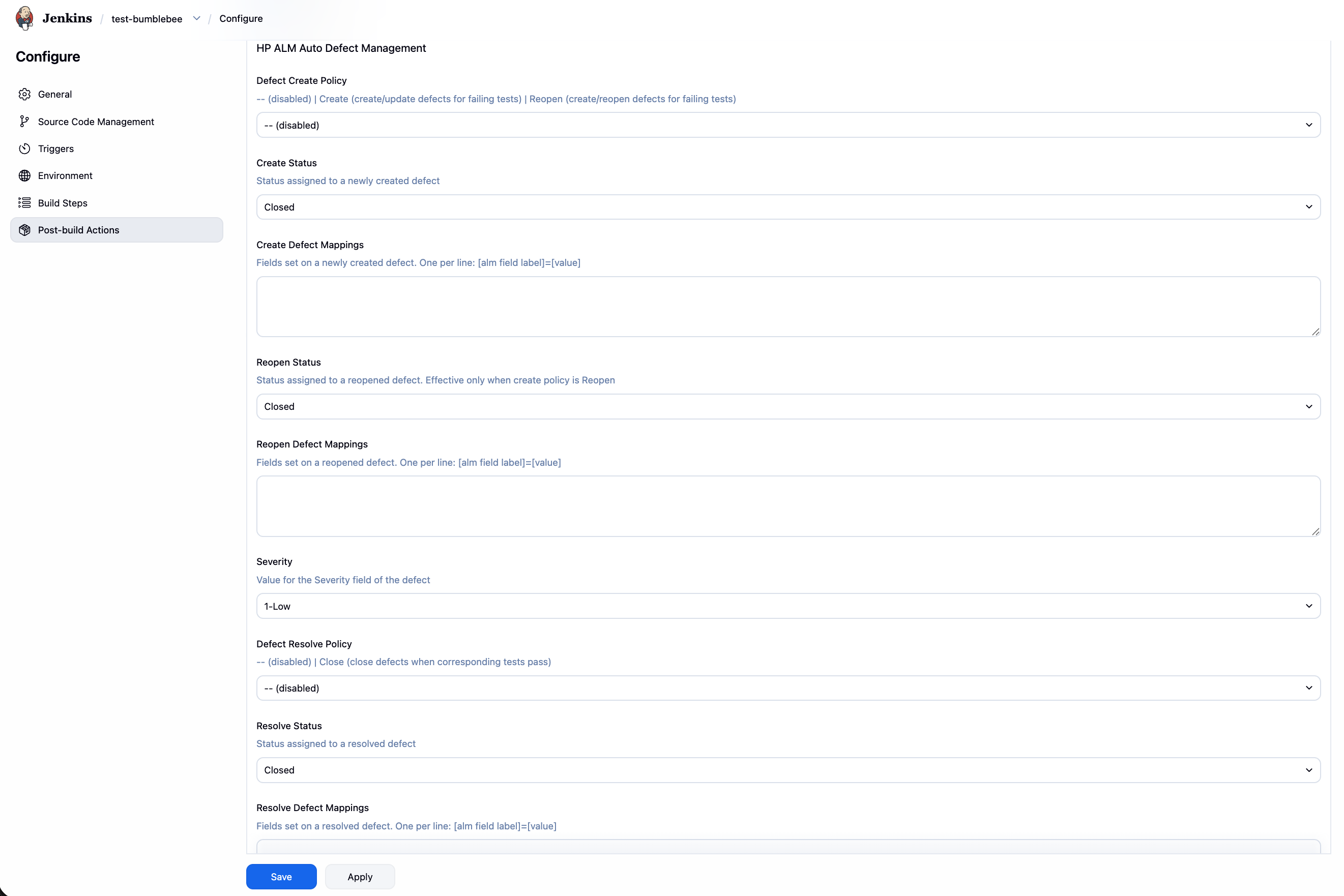 | Defect Create Policy | -- disabled · Create create or update an open defect for each failing test · Reopen create or reopen a defect for each failing test |