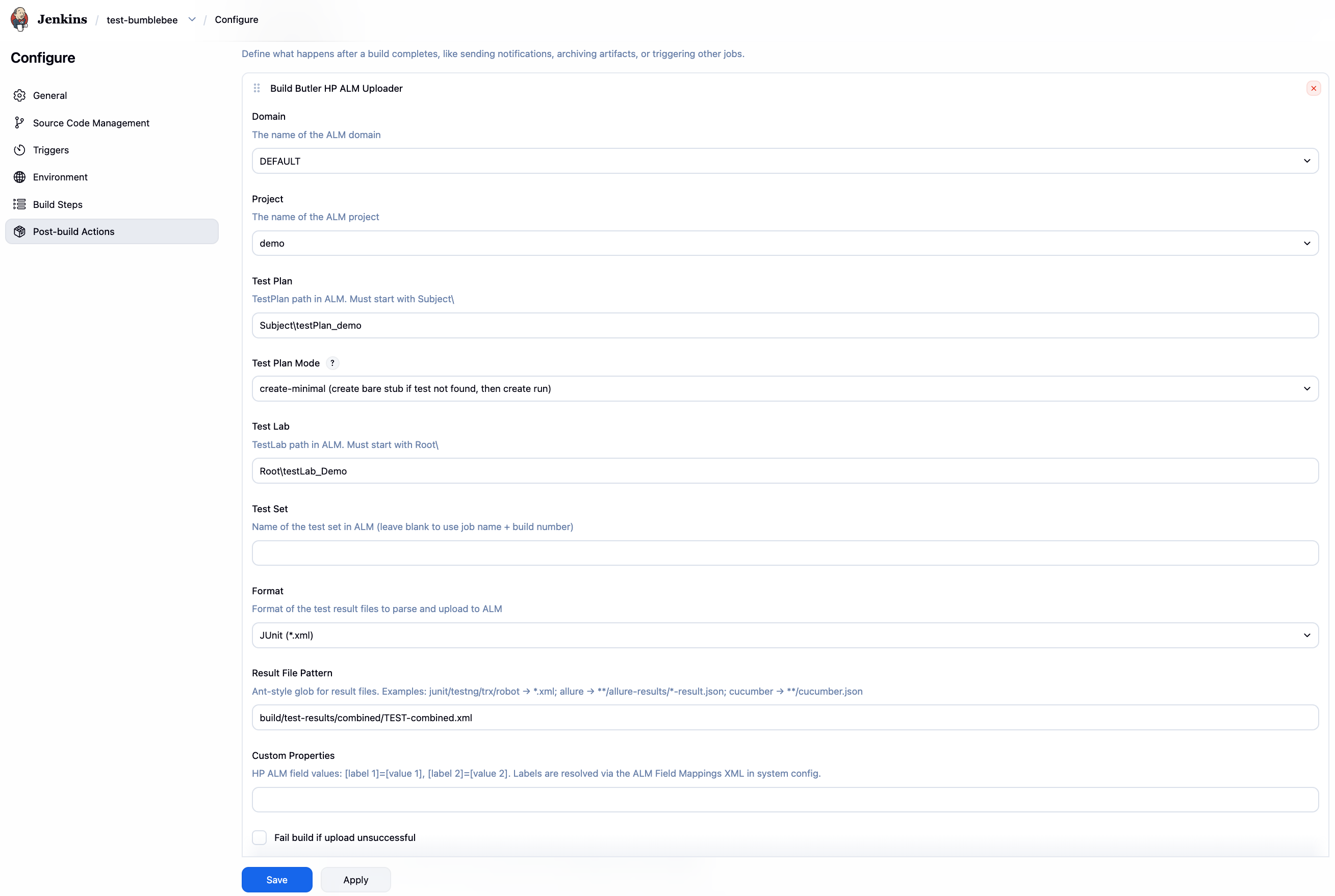 Add Build Butler HP ALM Uploader as a post-build step to any Jenkins job that should push results to ALM. This step runs after the build and uploads test results directly to ALM using the credentials configured in Manage Jenkins → BuildButler Local → ALM Integration.