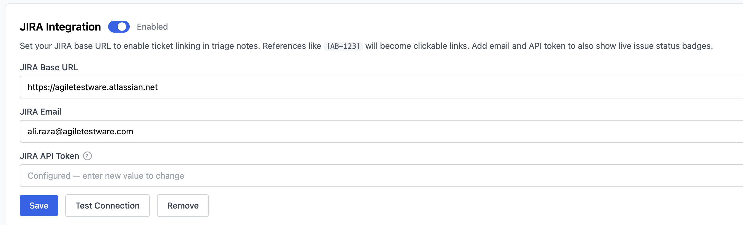 Set your JIRA base URL to enable ticket linking in triage notes. References like [AB-123] will become clickable links. Add email and API token to also show live issue status badges.